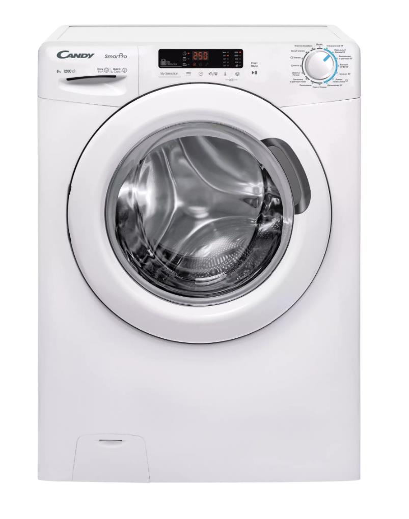 Стиральная машина Candy Smart Pro CSH44283DW/2-07 – автомат с фронтальной загрузкой 8 кг. Вы можете выбирать 1 из 17 автоматических программ, вручную выставлять температуру нагрева в диапазоне 20 - 90 °C и скорость отжима до 1200 об/мин. Дисплей показывает активные режимы и функции, время до конца цикла.