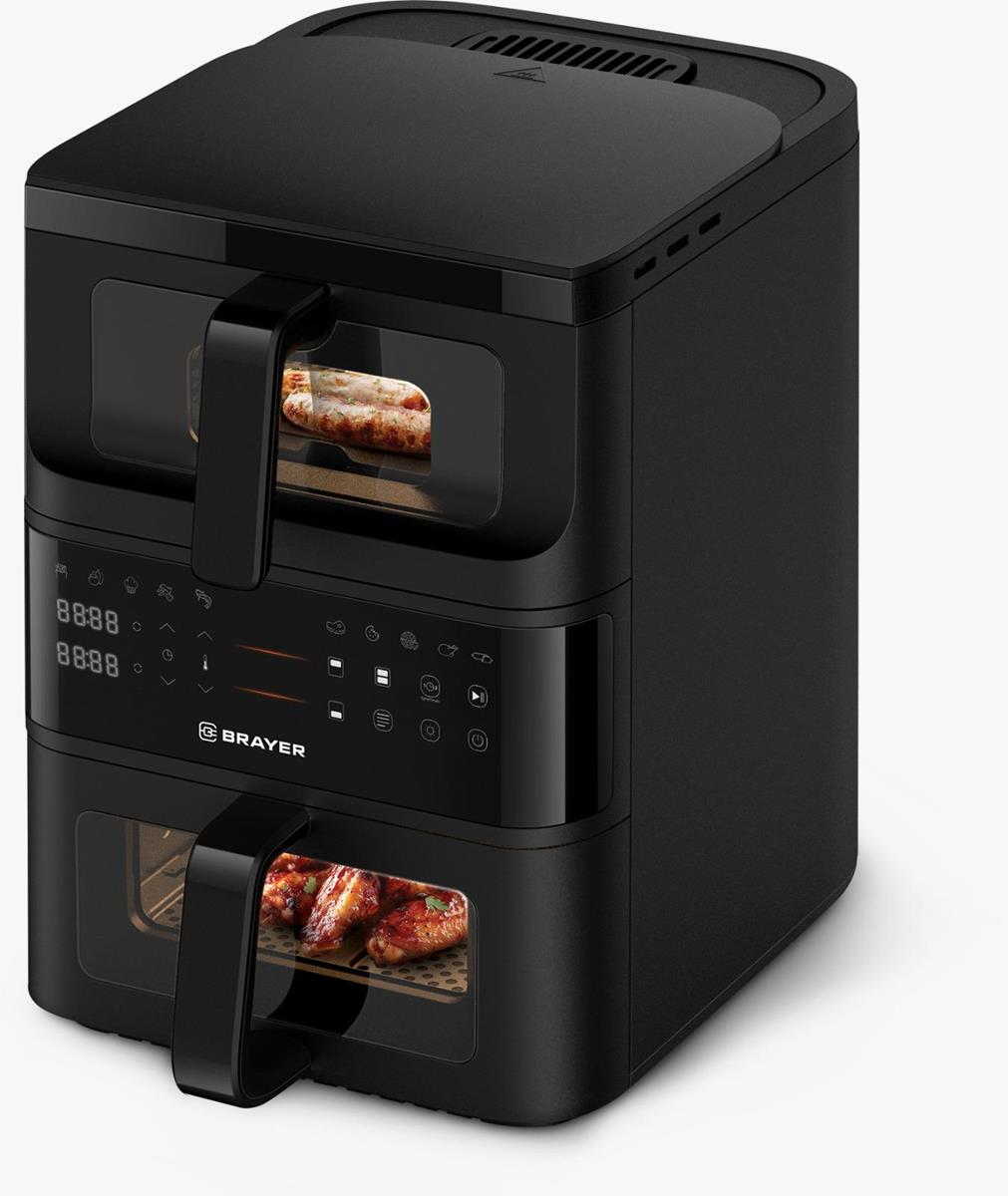 Индивидуальная настройка программ для каждой чаши 10 программ: фри, овощи, кекс, крылья, морепродукты, мясо, печенье, пицца, птица, колбаски Корпус из высокопрочного термостойкого пластика. Объем верхней чаши 3,5 л Объем нижней чаши 6,5 л