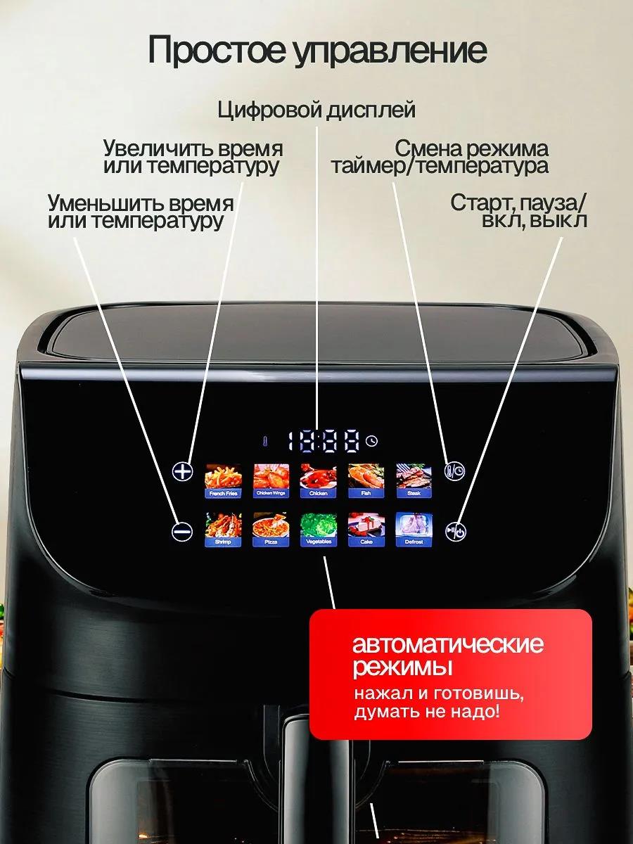 Умное управление (Smart-контроль): 10 автоматических программ: Картофель фри, куриные крылышки, целая курица, рыба, стейк, креветки, пицца, овощи, торт, разморозка. Достаточно выбрать продукт — прибор сам установит оптимальные время и температуру. Ручная настройка: Гибкая регулировка температуры (от 80°C до 200°C) и таймера (до 60 минут) для творческих задач. Автоматическое отключение по окончании программы.