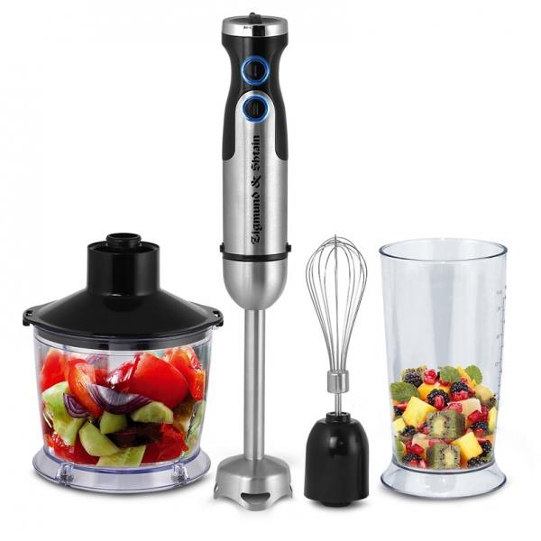 Блендер погружной Zigmund Shtain BH-345 M многофункциональный прибор 3 в 1 с расширенным набором насадок и аксессуаров. Он может измельчать, взбивать, готовить пюре.