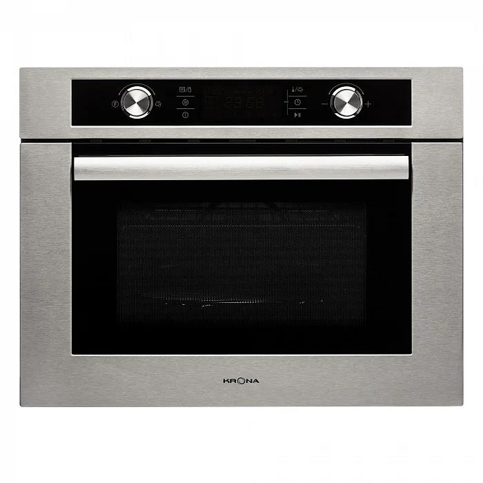 Электрический духовой шкаф KRONA DUETTO 60 IX характеризуется стильным оформлением в серебристо-черной расцветке и расширенными возможностями приготовления, включая функцию микроволновой печи с 5 уровнями мощности. Данная модель предлагает 11 режимов, конвекцию 3D и 13 программ приготовления. Вместимость внутренней камеры составляет 44 л. Панель управления с цифровым дисплеем, сенсорными кнопками и поворотными переключателями позволяет легко управлять всеми доступными функциями. Духовой шкаф KRONA DUETTO 60 IX поставляется в комплекте с круглым противнем, стеклянным противнем и решеткой. Система тангенциального охлаждения, функция блокировки управления и дверца с тройным остекленением обеспечивают высокий уровень безопасности. Среди других особенностей отмечается подсветка для контроля степени готовности блюд.