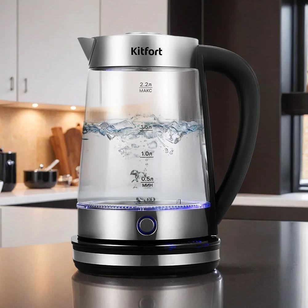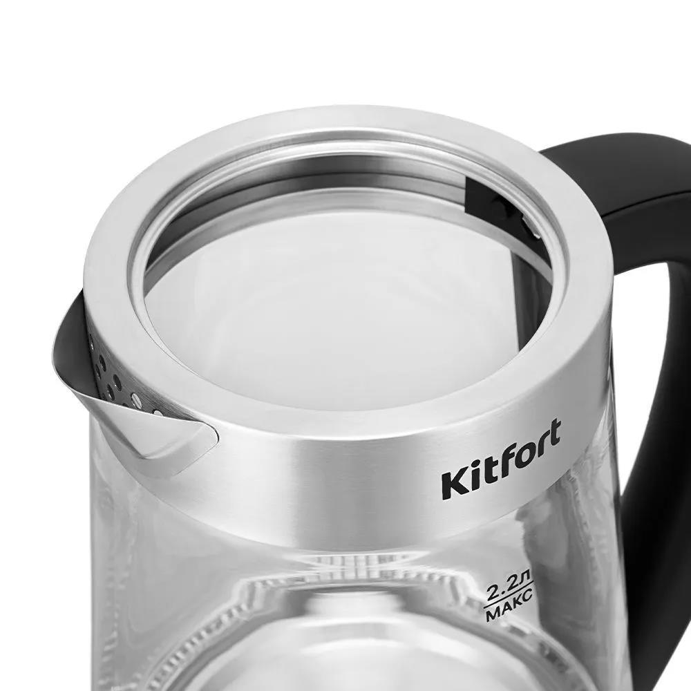 Электрический чайник Kitfort КТ-6764 (1800 Вт/2,2 л /стекло, нержавеющая сталь/прозрачный, черный, серебристый)
