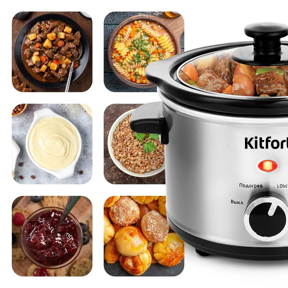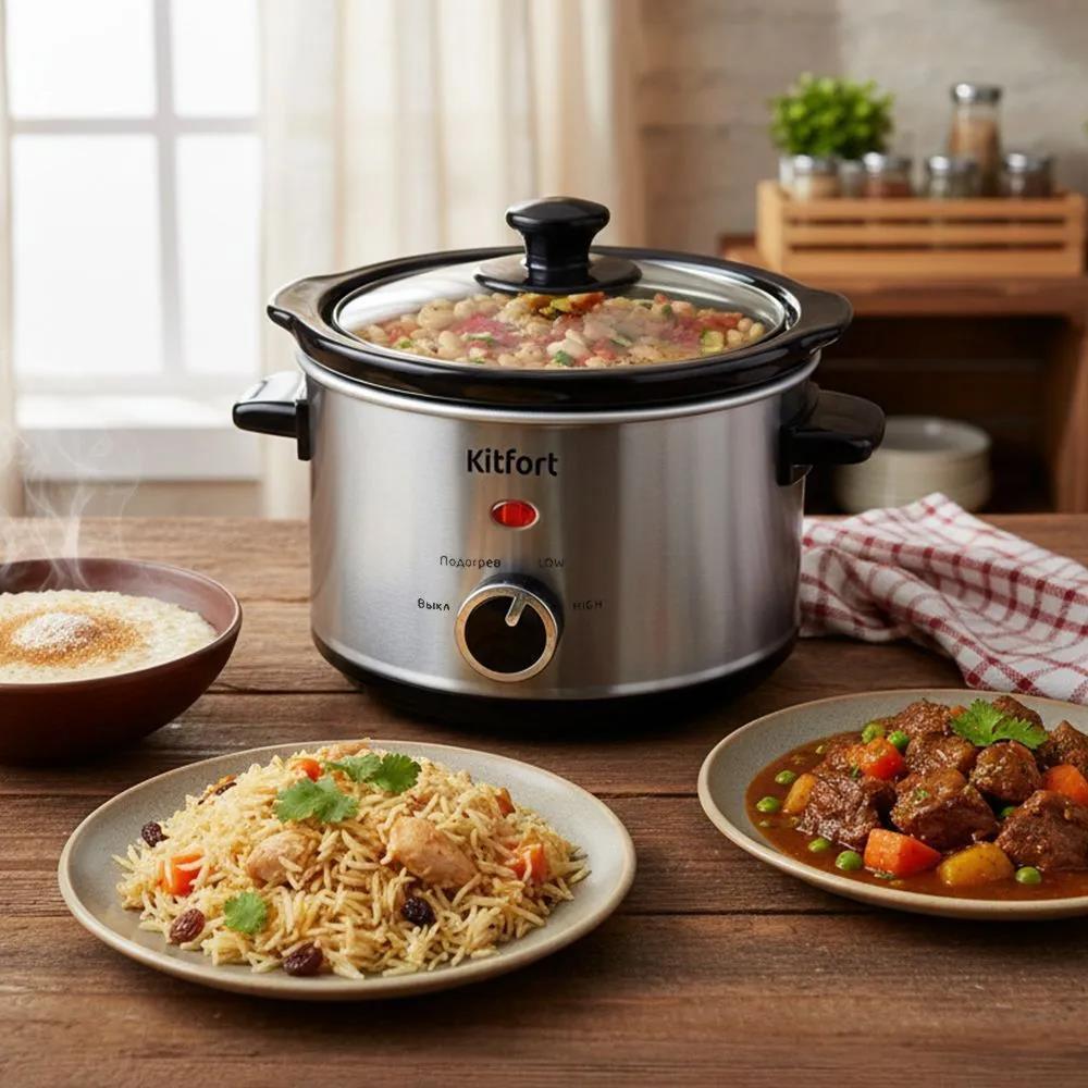Медленноварка Kitfort КТ-205 готовит блюда особым способом – томлением. Температура лежит в диапазоне 60-120° C. Этот способ идеален для блюд длительного приготовления, как каши, рагу, жаркое, варенье, плов, выпечка, топлёное и сгущённое молоко и др. У медленноварки 3 режима работы: LOW – длительное томление 4-12 часов, HIGH – интенсивное приготовление от 3 до 8 часов. Также у медленноварки есть режим подогрева уже готовой пищи.