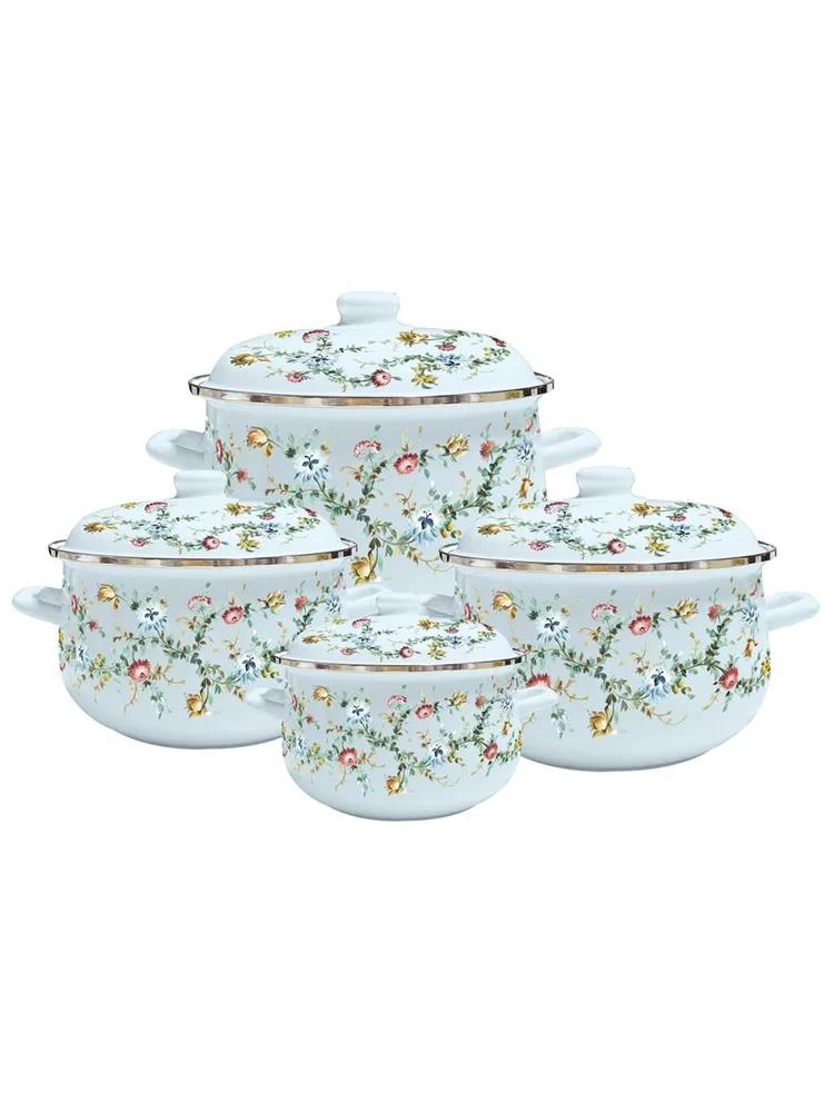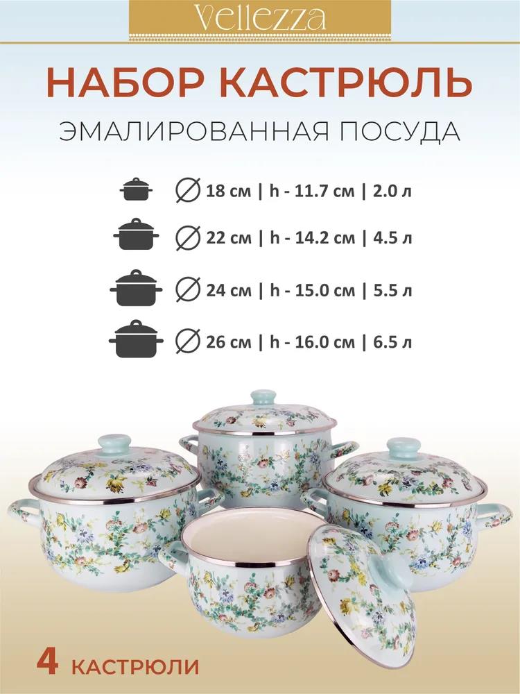 8 предметов: 4 эмалированные кастрюли 4 эмалированные крышки Размеры: Ø 18 | h-11.7 см | 2.0 л Ø 22 | h-14.2 см | 4.5 л Ø 24 | h-15.0 см | 5.5 л Ø 26 | h-16.0 см | 6.5 л