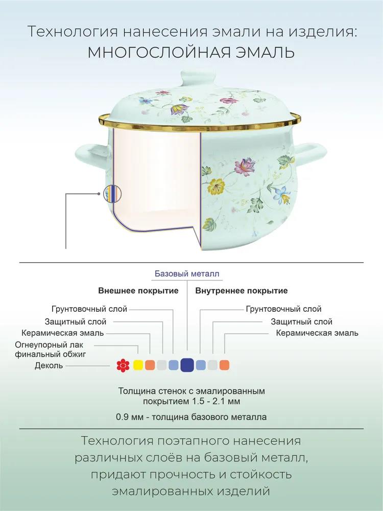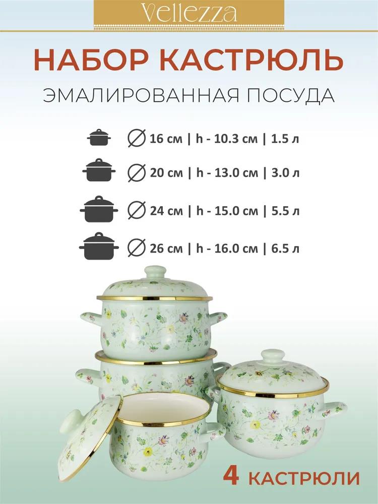 8 предметов: 4 эмалированные кастрюли 4 эмалированные крышки Размеры: Ø 16 | h-10.3 см | 1.5 л Ø 20 | h-13.0 см | 3.0 л Ø 24 | h-15.0 см | 5.5 л Ø 26 | h-16.0 см | 6.5 л