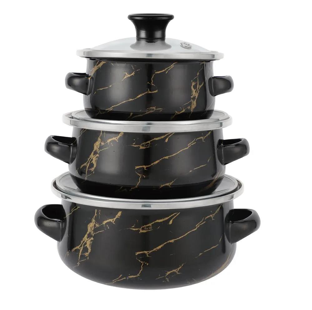 6 предметов Кастрюля с жаропрочной стеклянной крышкой 0.5л Кастрюля с жаропрочной стеклянной крышкой 0.7л Кастрюля с жаропрочной стеклянной крышкой 1.1л 3-х слойное внешнее эмалированное покрытие 3-х слойное внутреннее эмалированное покрытие Жаропрочные стеклянные крышки с ручками