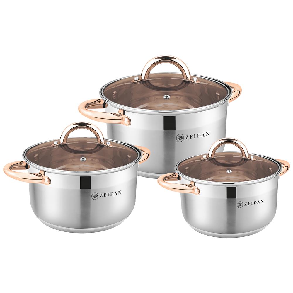 Набор посуды, 6 предм. (3 КАСТРЮЛИ С КРЫШКАМИ: 2.7 Л (d18 см ), 3.8 Л (d20 см ), 6.4 Л (d24 см ), нержавеющая сталь, 5-ти СТЕПОВОЕ КАПСУЛИРОВАННОЕ ДНО, цветная стеклянная крышка с ручкой «ПОД ЗОЛОТО», ручки на корпусе «ПОД ЗОЛОТО», внутренняя – зеркальная полировка корпуса, снаружи – комбинированная полировка корпуса.