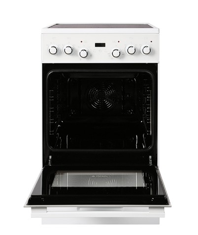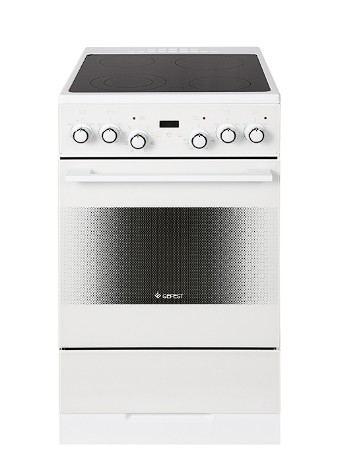 Электрическая плита выполнена в классическом белом цвете, что делает её универсальной для любого интерьера. Стеклокерамическая варочная поверхность шириной 50 см не только выглядит стильно, но и легко чистится. Механическое управление позволяет точно регулировать температуру и режимы работы.
