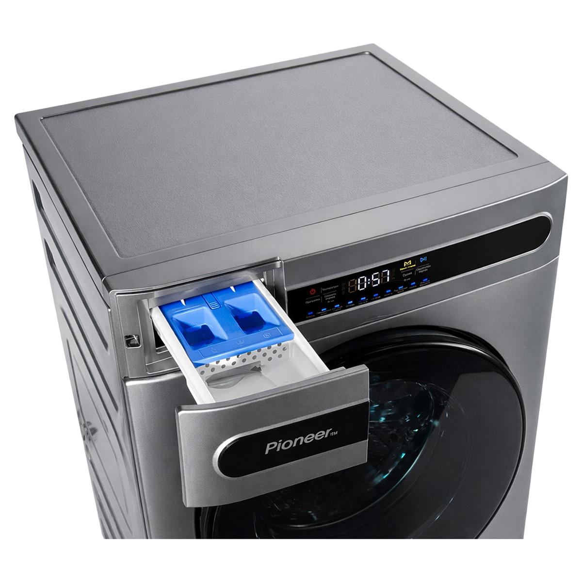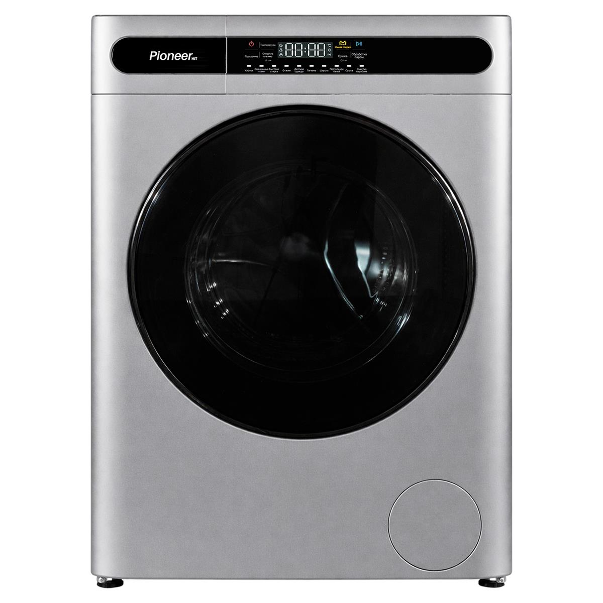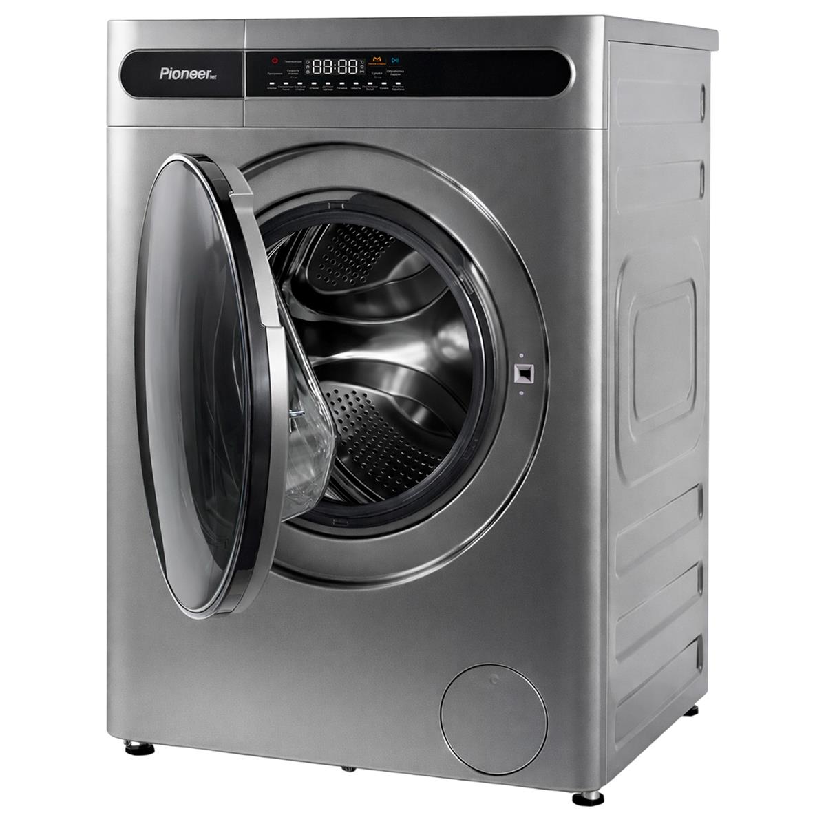 Pioneer WMD-141101M_SL — это современная отдельно стоящая стирально-сушильная машина серебристого цвета с инверторным двигателем и функцией стирки паром.