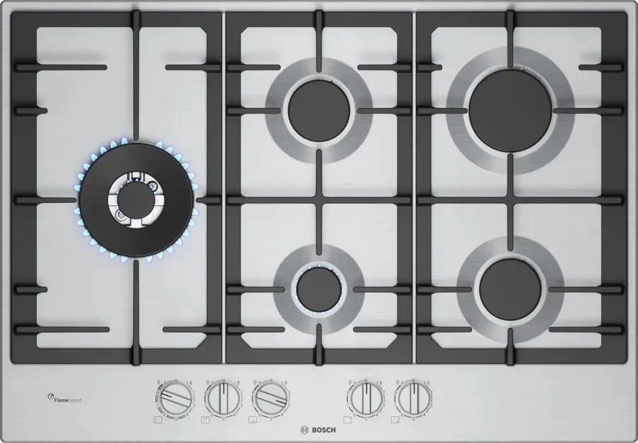 Газовая варочная панель Bosch PCS7A5I90 имеет пять конфорок с разноуровневой мощностью, суммарная мощность которых достигает 12.5 кВт: левая зона с WOK-конфоркой мощностью 5 кВт обеспечивает интенсивный нагрев для больших сковород и литых посуд, задняя правая — 3 кВт, передние и задние боковые зоны — от 1 до 1.75 кВт, что даёт широкий диапазон регулировок и позволяет одновременно готовить разнообразные блюда. Пять зон сочетаются с девятью ступенями мощности, благодаря чему можно точно подбирать интенсивность нагрева для тушения, кипячения, жарки и медленного томления. Такая конфигурация пригодится при готовке больших трапез и при необходимости одновременно использовать несколько ёмкостей различных объёмов. Практичность подчёркивается чугунными решётками, которые отличаются устойчивостью к нагрузкам и высокой термостойкостью, обеспечивая надёжную опору для тяжёлой посуды. Чугунная структура также равномерно распределяет вес, что делает эксплуатацию более комфортной. Материал рабочей поверхности — нержавеющая сталь — прост в уходе, устойчив к механическим воздействиям и сохраняет эстетический вид при регулярном использовании; это выгодный выбор для тех, кто ценит сочетание практичности и презентабельности.