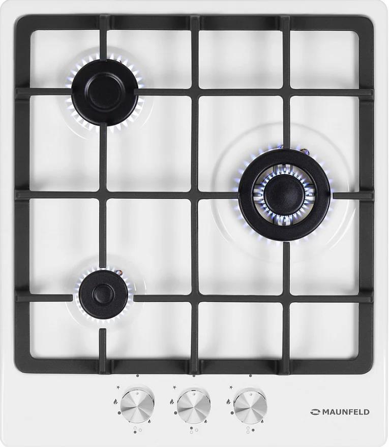 Варочная панель Maunfeld EGHE.43.33CW/G представлена в белом цвете со стальной фурнитурой. Модель из коллекции «Модерн» относится к газовому типу. Материал поверхности металл, покрытый эмалью. Решетки выполнены из чугуна, устойчивого к влиянию высоких температур и механических воздействий. Ниша для встраивания имеет следующие размеры 41×48 см. Три конфорки расположены таким образом, чтобы можно было использовать не только стандартную посуду, но и другую утварь для приготовления пищи. Прибор можно подключить как к магистральному трубопроводу, так и к баллону. Механическое управление осуществляется с помощью поворотных переключателей, которые представлены цельнометаллическими полнотелыми ручками. В комплекте идут жиклеры для баллонного газа.