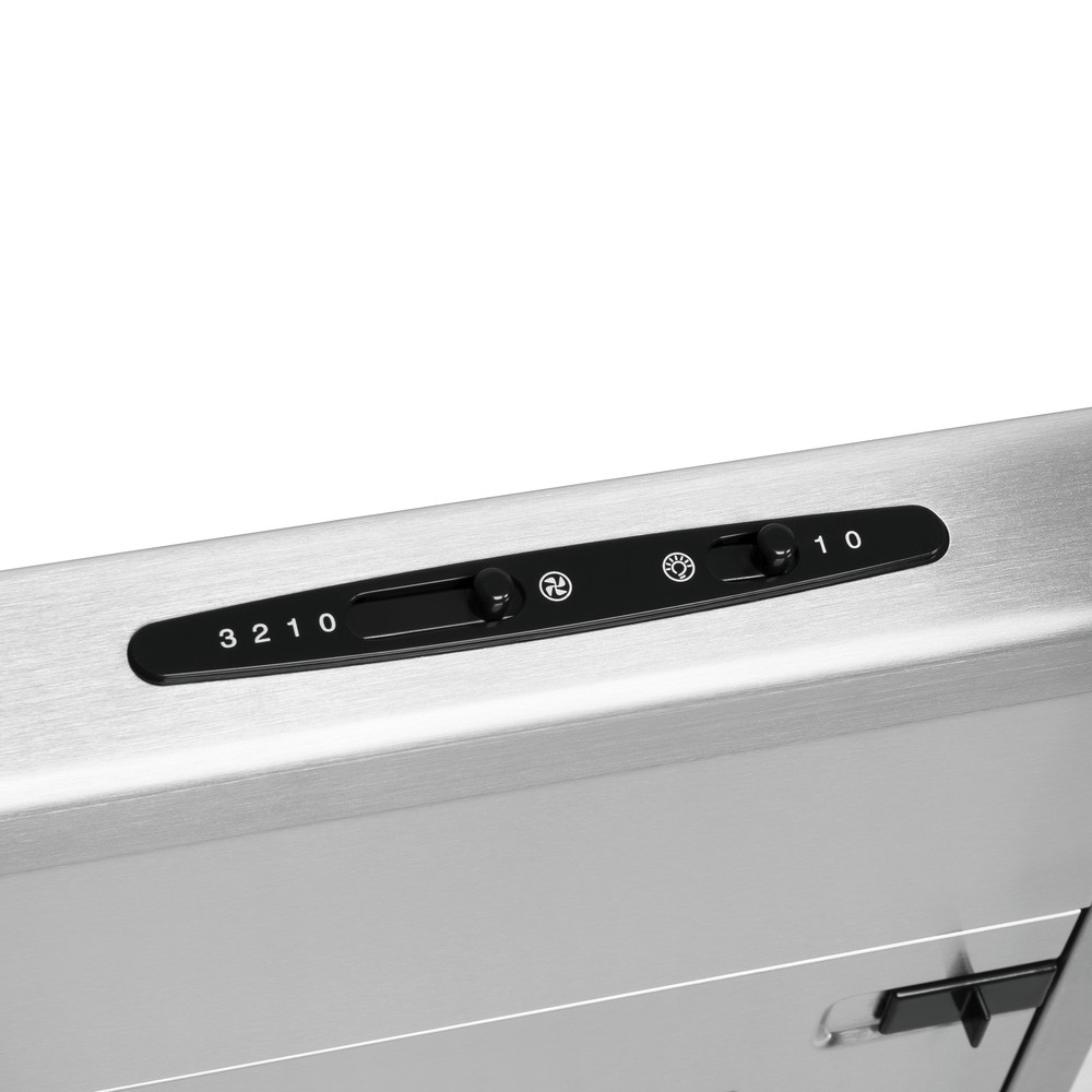 Вытяжка подвесная HOMSair HORIZONTAL 50 может похвастаться увеличенной до 420 м³/ч производительность, что обеспечивает полноценное обслуживание кухни площадью до 15 кв.м. Выбор между 3 скоростными режимами производится посредством панели управления с ползунковыми переключателями.